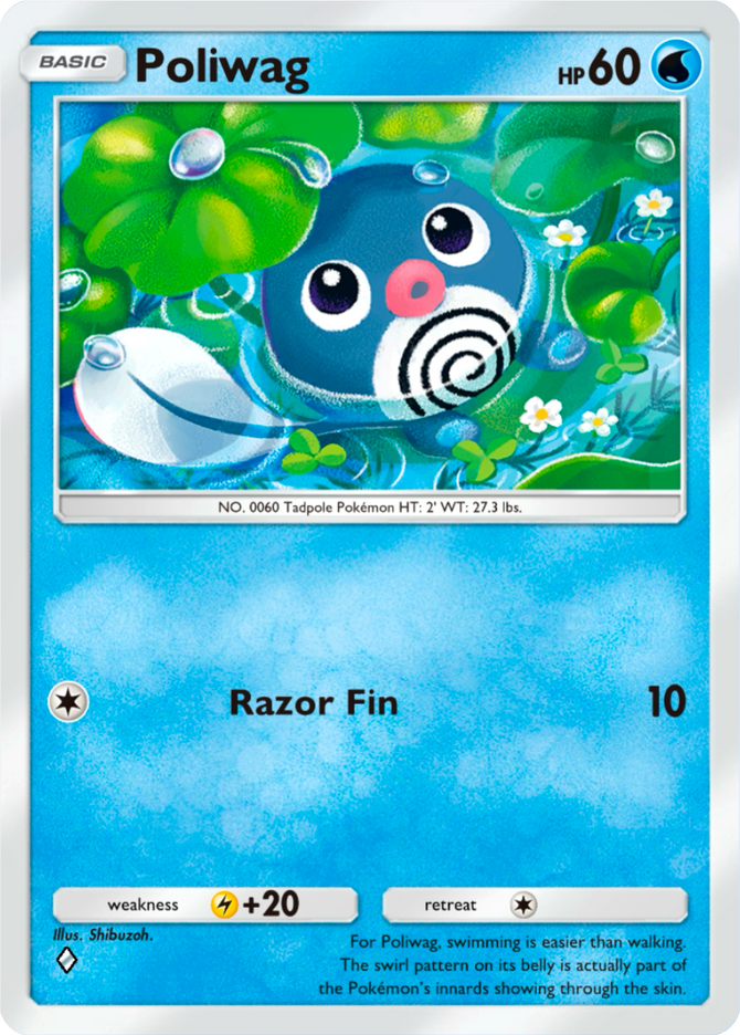 For Poliwag, swimming is easier than walking. The swirl pattern on its belly is actually part of the Pokémon’s innards showing through the skin.