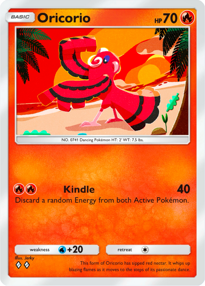 This form of Oricorio has sipped red nectar. It whips up blazing flames as it moves to the steps of its passionate dance.
