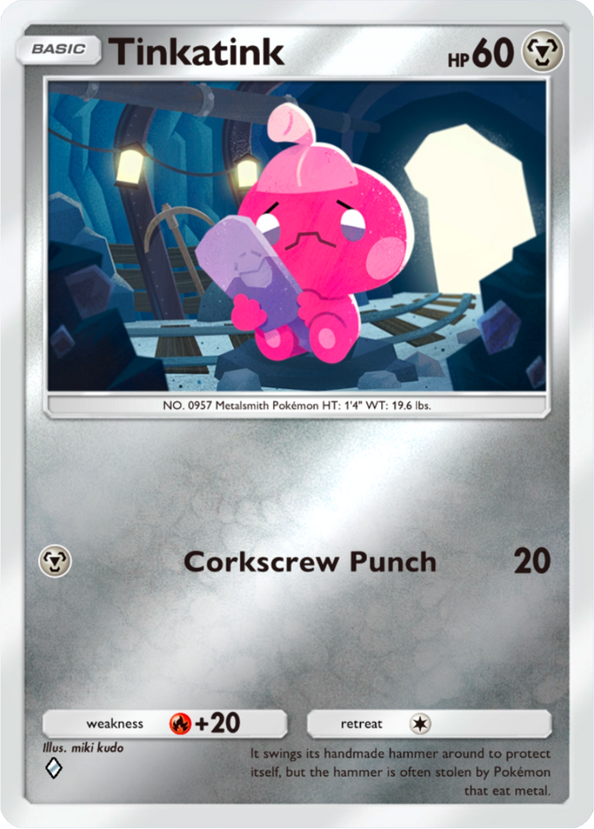 It swings its handmade hammer around to protect itself, but the hammer is often stolen by Pokémon that eat metal.