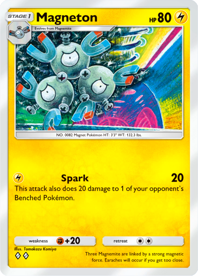 Three Magnemite are linked by a strong magnetic force. Earaches will occur if you get too close.