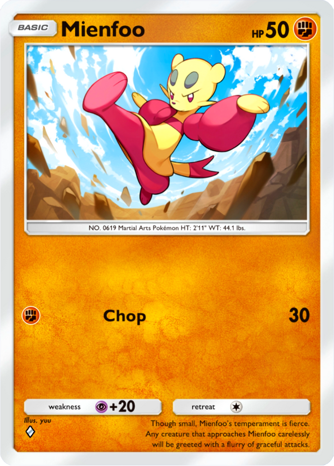 Though small, Mienfoo’s temperament is fierce. Any creature that approaches Mienfoo carelessly will be greeted with a flurry of graceful attacks.